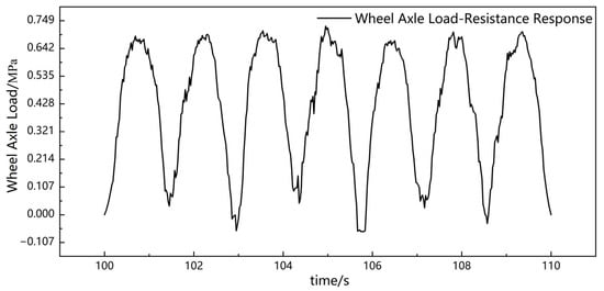 The sensor has a significant resistance drop when subjected to wheel load, and the drop amplitude is stable at the same level. In this paper, the experimental results between 100 and 110 s during the experiment were selected, and the axle load conversion was carried out according to the response fitting curve (3) of the sensor after embedding, as shown in Figure 9.
