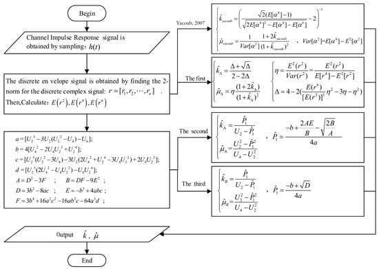 Equations (8)–(10) form a channel parameter estimation model with respect to variables k and μ. In this model, represents the total signal power, while can be estimated from either empirical measurements or simulation data. Transforming Equation (9) into a function with respect to μ, we obtain:
