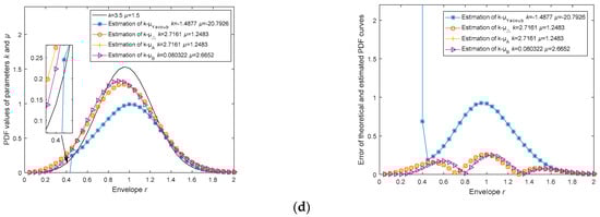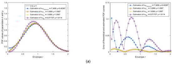 Due to the probability density function (PDF) of the κ-μ fading channel model being controlled by the model parameters κ and μ, existing research has not yet been able to explain the conversion relationship between these two parameters. Consequently, it is not possible to evaluate the accuracy of the estimation algorithm using the deviation distance between the theoretical and estimated values. Therefore, this paper employs the error between the theoretical PDF curve and the estimated PDF curve, as well as the root mean square error (RMSE), to evaluate the estimation accuracy of the algorithm. The RMSE reflects the degree to which a set of data deviates from the true data. As the RMSE approaches 0, it indicates a smaller deviation between the theoretical PDF curve and the estimated PDF curve, resulting in higher estimation accuracy. The mathematical expression for RMSE is given as , where represents the minimum and maximum values of the envelope. In the experiments of this paper, the gradient is 0.01. In the equation, is the theoretical probability (assumed to be ) when the envelope is equal to , and is the estimated probability (assumed to be ) when the envelope is equal to . The calculation method of RMSE can be expanded as .