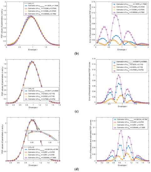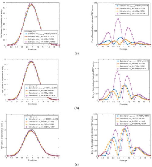 In Figure 2, the left column of the plots demonstrates the comparison between the PDF curves calculated from the estimated k and μ parameters and the theoretical PDF curves. The right column of plots shows the errors between the four estimated PDF curves and the theoretical PDF curves. In Table 3, RMSEpdf refers to the root mean square error between the PDF curve and the theoretical PDF curve, while the last column displays the ranking of estimation accuracy for each estimator in each experiment.