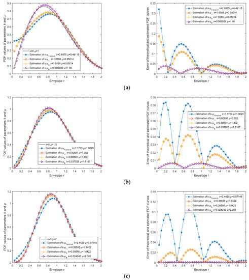 Estimation accuracy analysis of k, µ parameter estimation algorithm based on Monte Carlo method generated k-µ channel data; (a) Comparison the error of theoretical PDF and estimated PDF curves at k = 0, µ = 1; (b) Comparison the error of theoretical PDF and estimated PDF curves at k = 0, µ = 1.5; (c) Comparison the error of theoretical PDF and estimated PDF curves at k = 0, µ = 2.