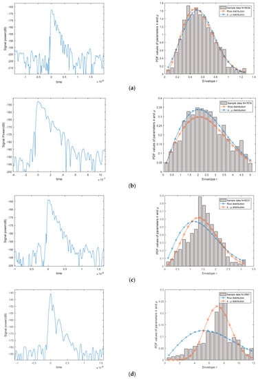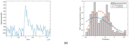 The classical Rician channel model assumes that the obstacles in the channel follow a uniform distribution, and it defines the signal that arrives at the receiver as a cluster; there is no time correlation between each electromagnetic wave, and the energy fading of the electromagnetic wave obeys a normal distribution and the phase follows a uniform distribution. However, under practical scenario conditions, the electromagnetic waves that arrive at the receiver will be time-dependent because of the non-uniform distribution of the obstacles in the channel, and the CIR will show multiple energy peaks in the experimental data. According to the multiple-cluster effects of the transmitted electromagnetic waves arriving at the receiving end, the electromagnetic waves can be divided into a set of clusters; the number of clusters is denoted by μ, and each cluster is individually subject to the Rice distribution. This new method for modeling electromagnetic waves was first proposed by Yacoub [] and is called the k-µ fading distribution model. The cumulative electrical frequency amplitude (envelope) of the µ clusters of electromagnetic waves that arrive at the receiver satisfies the following physical model [].