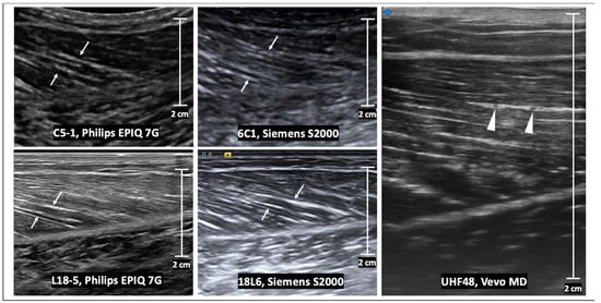 Longitudinal B-mode ultrasound images of a medial gastrocnemius muscle in a healthy volunteer. The echogenic perimysia are evident on all images (arrows), but the appearance differs with varying transducer frequency and vendor reconstruction algorithms. At ultra-high frequencies (e.g., using the UHF48 transducer), intramuscular veins are evident within a layer of the perimysium (arrowheads). Scale bars represent 2 cm.