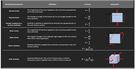 Strain and elasticity are important concepts to review in US strain imaging and SWE. Strain is described as the change in length of a tissue, relative to its original length, that results from an applied stress [57]. Stress is defined as the magnitude of the applied force divided by the tissue’s cross-sectional area. Elasticity can be described as the tissue’s resistance to shape and volume changes under an applied force [57]. The ability of solids to withstand changes in shape and volume is due to their possession of shear and volume elasticity. In contrast, liquids possess volume elasticity, but no shear elasticity since their shape changes under an applied shear stress (i.e., shear stress results in a velocity gradient in liquids depending on their viscosity) [58]. Biological tissues are usually considered as viscoelastic material as they also possess both an elastic component (often modeled as a spring) as well as a time-dependent viscous element (often modeled as a dashpot) in their response. Therefore, they contain both shear and volume elasticities, though the volume elasticity is much greater than the shear elasticity [59]. The elasticity modulus can be quantified based on the stress and strain direction. Young’s modulus, (E), equal to stress divided by strain, quantifies a material’s stiffness and its ability to resist deformation in the perpendicular direction when subjected to an external force. Shear modulus, G, represents the ability of a material to resist shear deformation, which arises when two parallel forces are applied to opposite surfaces of a material [57]. The basic mechanical properties discussed in this paper and their definitions are summarized in Figure 4.
