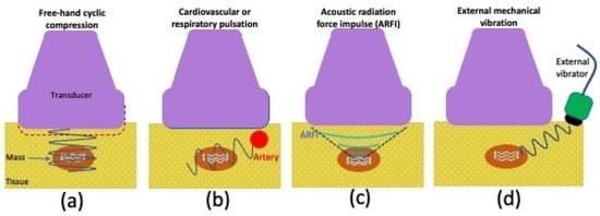 Graphic illustrating various strain ultrasonography techniques, including (a) using cyclic compression with a free hand, (b) pulsation from internal organs such as the heart or lungs, (c) acoustic radiation force impulse, or (d) vibration from an external source.