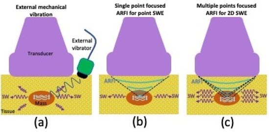 Graphic illustrating various shear wave elastography (SWE) techniques, including (a) vibration from an external mechanism, (b) single-point focused acoustic radiation force impulse as with point-SWE, or (c) multiple-point focused acoustic radiation force impulse as with 2D-SWE.