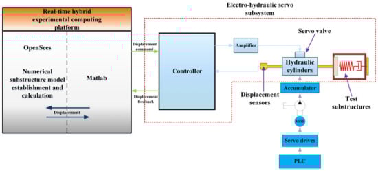 The real-time hybrid test (RTH) [] is a test method to study the performance of testing the response of large structures under dynamic loading. The whole test structure consists of a numerical substructure and a physical substructure, the former is calculated by a computer for numerical simulation, and the latter act as the displacement on the physical experimental structure by communicating with the electro-hydraulic servo displacement system through the computer [,]. As a test system with high requirements for real-time, RTH, during the numerical simulation calculation, signal output, and signal acquisition, the hydraulic cylinder actuator detects the displacement and the desired displacement. There are problems with hysteresis and errors, and the electro-hydraulic servo system, as an actuator, affects the performance of the whole RTH system.