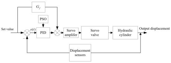 In this paper, the FF-PSO-PID algorithm is proposed to control the electro-hydraulic servo system in the real-time hybrid test (RTH), which uses the PSO algorithm to optimize the PID parameters and the feed-forward compensation algorithm to compensate the displacement. As shown in Figure 5, on the basis of the PSO algorithm, to rectify the PID parameters and reduce the system displacement error and response time, feed-forward displacement compensation is introduced to reduce the system error through feed-forward compensation of the direct control system, while improving the response speed and reducing the unnecessary system lag phenomenon.