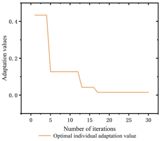 where , ,  and  are the weights of the performance indicators, and different weights affect different system performance effects.  is the overshoot,  is the time integral of the absolute value of the error multiplied by time,  is the regulation time, and  is the rise time. A penalty factor is placed in the objective function , and when the regulation time is greater than 0.3, it is no longer calculated. When overshoot occurs, the amount of overshoot is used as one of the optimal indicators.