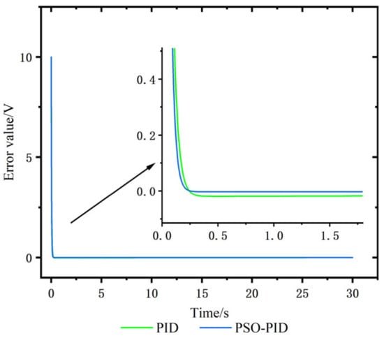 A step signal of 110.011 mm is used as the reference trajectory of the electro-hydraulic displacement servo system, and the conventional PID and PSO-PID are compared and analyzed. Modeled in Simulink, the simulation plots of the two control algorithms are shown in Figure 7, Figure 8a shows the input voltage, and the response curves under the step signal are shown in Figure 8b. The error response curves of the two algorithms under the step signal are shown in Figure 9.