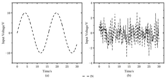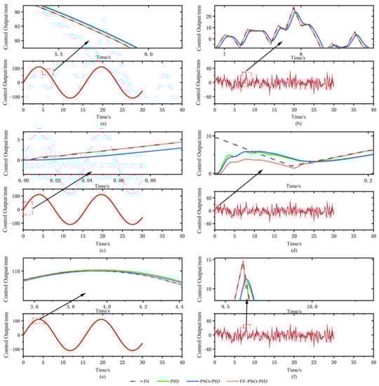 The stochastic signal is used as the reference trajectory of the electro-hydraulic displacement servo system, and the simulation plots of the three algorithms are shown in Figure 10. Figure 11b shows the input voltage signal, and the random signal response curves of the three algorithms are shown in Figure 12b,d,f.