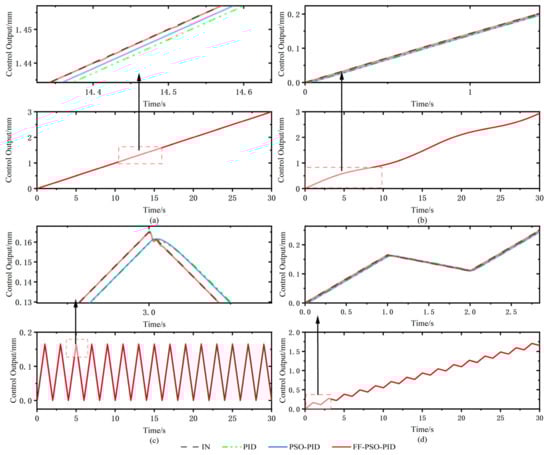 In order to verify the applicability and effectiveness of the algorithm for different input signals, based on the verification by step signal, sinusoidal signal, and random signal, simulation tests were conducted under the signals such as ramp and triangle wave as in Figure 13, respectively. As shown in Figure 13a, the input signal is a ramp signal with a slope of 0.1, and the tracking error and time hysteresis of the FF-PSO-PID algorithm are close to 0, while the errors of PSO-PID and conventional PID are 0.002 mm and 0.004 mm, and the hysteresis times are 0.024 s and 0.05 s, respectively. As shown in Figure 13c, at the crest of the wave under the triangular wave signal, the tracking error and time lag of FF-PSO-PID algorithm are close to 0. The error and time lag of PSO-PID and conventional PID algorithms are more obvious, the displacement error reaches 0.01 mm and 0.009 mm, and the time lag is 0.028 s and 0.031 s, respectively. In comparison, FF-PSO-PID algorithm has applicability and effectiveness for various input signals. The tracking performance is superior to that of the other two algorithms.