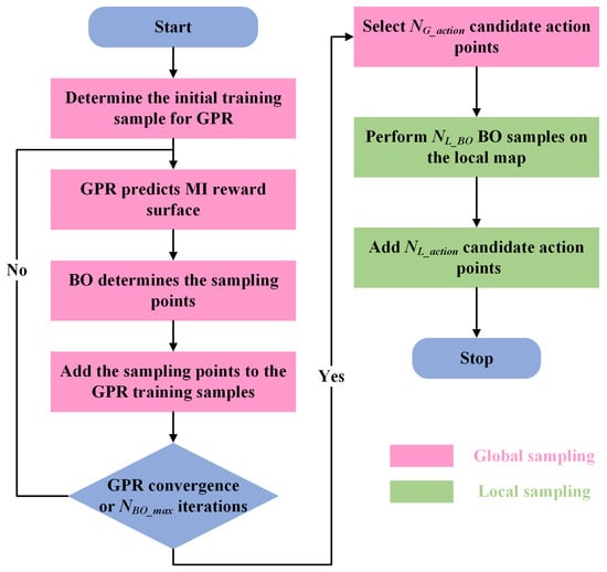 This section describes how the process of determining a robot’s candidate action points through BO sampling is performed. The overall process is shown in Figure 2. Firstly, sampling points from a 2D Sobel sequence [49] are selected to form the initial training sample. GPR [50,51] predicts the posterior mean and variance of the currently occupied map based on the initial training sample. The posterior mean represents the predicted MI reward surface of the current occupancy map, and the variance represents the degree of uncertainty of the current predicted MI reward surface. After GPR convergence or the maximum number of iterations is reached, we use the posterior mean as the MI reward surface of the currently occupied map and select sampled points with the highest MI gain as the candidate action points for the robot. To prevent the robot from having no candidate action points in the local environment, we also sample the local map times (BO sampling) and select sample points with the highest MI gain, which are added to the candidate action points of the robot. After several experiments, we set to 40, to 60, to 20, to 20 and to 5.