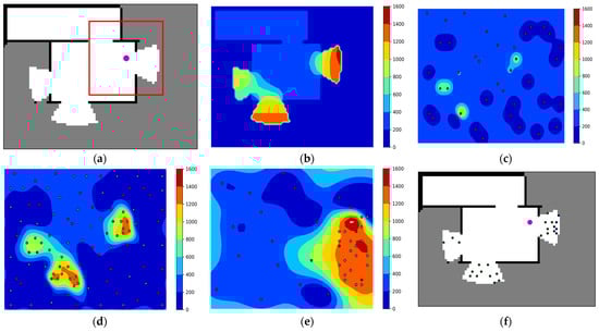 Figure 3 illustrates how to determine candidate action points for the robot using BO sampling. Figure 3a shows the currently built occupancy map, robot position, and local map. Figure 3b shows the “ground truth” of MI, which is the actual MI reward surface for the current occupancy map. Figure 3c shows the initial training sample for GPR and the predicted MI reward surface based on this. Figure 3d shows the MI reward surface and training samples after 60 BO iterations. Figure 3e shows the MI reward surface and the local sampling points predicted based on the local map. Figure 3f shows the selected local and global candidate action points.