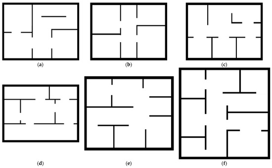 We design a Python-based simulation platform to train the intelligent robot, using a beam-based sensor model to simulate the robot’s exploration of its environment and an A* algorithm to plan the robot’s path to a target point. We assume that the robot can move omnidirectionally and has an all-round 360° field of view with a resolution of 0.5° and that the sensor can detect a circular area with a radius of 20 pixels. We train and test our algorithm on maps of different layouts and sizes selected from HouseExpo (a sizeable indoor layout dataset) constructed in [57]. Figure 5 and Table 1 show the details of the maps.
