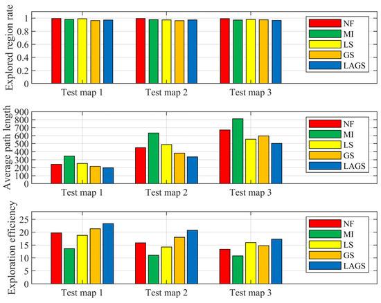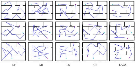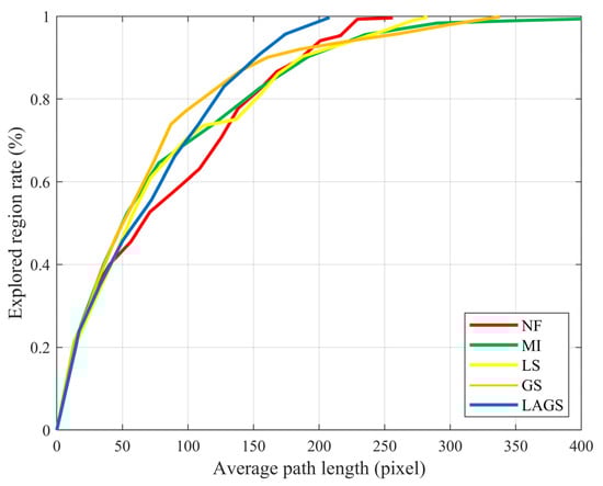 As can be seen in Figure 6, the LAGS algorithm had better performance and shorter paths than other algorithms. The average path length of LAGS was 18.8%, 49.3%, 26.4%, and 38.4% shorter than the average path length of NF, MI, LS, and GS, respectively. We can see that MI, LS, and GS showed good exploration efficiency in the early exploration stage. However, the exploration efficiency decreased to varying degrees in the latter stage of exploration due to the influence of the regional legacy issues, and the decrease was especially obvious for MI and GS. LAGS and NF were less affected by the regional legacy issues. They maintained a more stable exploration efficiency throughout the exploration process, with the overall exploration efficiency of LAGS being significantly higher than that of NF.