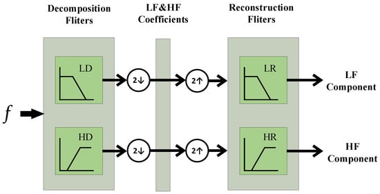 Wavelet decomposition is implemented through two filters: the low-pass filter (scaling filter) and the high-pass filter (wavelet filter) [32]. They share the same set of wavelet filter coefficients, but with alternating signs and in reversed order, which means they complement each other. After the signal down-sampling operation for each decomposition level, the signal reconstruction process is done by applying the inverse way to the decomposition process. Each reconstruction level is followed by a signal up-sampling operation, which is known as the Mallat algorithm, and the procedure is illustrated in Figure 1.