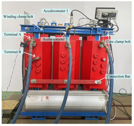 The loosening faults of the core, winding, and connection bar were simulated by adjusting the tightness of the clamp bolts from 50 to 80 Nm using a torque wrench, the turn-to-turn short circuit fault was simulated by connecting a resistor between terminals A and B. It is worth mentioning that all fault types have multiple load levels to represent changing loads.