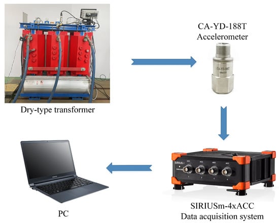 Two accelerometers with the sensitivity of 500 mV/g of type CA-YD-188T were used to collect vibration signals of the transformer. Then, the collected raw signals are processed by the SIRIUSm-4xACC data acquisition instrument with a sampling rate of 8000 Hz, and saved by the Devesoft X3 software. Considering the structural characteristics and insulation safety of the studied transformer, as shown in Figure 3, the above accelerometers were fixed in the vertical direction (CH1) and horizontal direction (CH2) of the core clamp, respectively. The whole experimental system is shown in Figure 4.