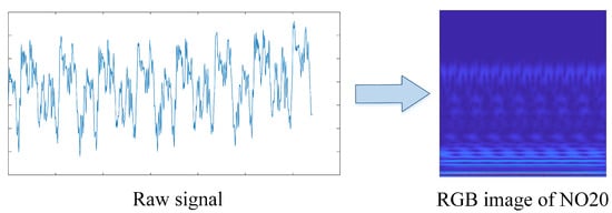 Figure 5 illustrates the converted RGB image of the normal state with load of 20 kW (NO20), and the remaining 9 cases are shown in Figure 6. It is obvious that the RGB pictures of different conditions have unique features in both the time domain and frequency domain, which demonstrates that the proposed feature extraction method works effectively.