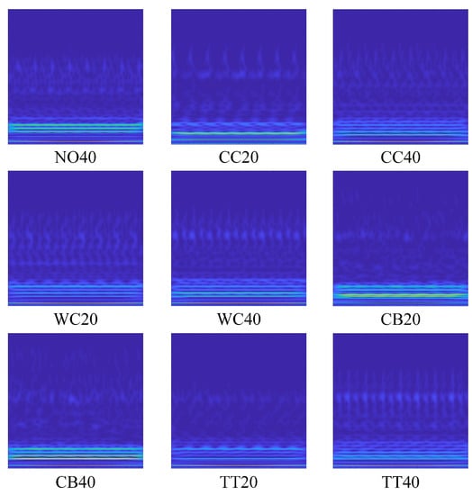 Wavelet transform is a popular tool for extracting time–frequency information from time-domain signals [28]. It inherits and develops the localization idea of short-time Fourier transform (STFT), and overcomes its shortcomings of a non-changing window size with frequency [29]. The wavelet transform can provide a “time–frequency” window that changes with frequency. Then, the time subdivision at high frequency and frequency subdivision at low frequency can be realized. There are two main types of the wavelet transform, CWT [30] and discrete wavelet transform (DWT) [31]. The difference between them is that CWT operates on all possible combinations of shifting and compression, while the DWT only operates on a specific subset of shifting and compression.