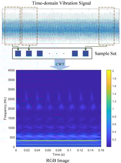 For the purpose of extracting sufficient feature information from the original vibration signal, CWT is used to process the vibration signal in this study. The length of the selected raw signal segment is 1280 (i.e., 160 ms), and the cmor3-3 (Morlet wavelet) is employed as the mother wavelet with a total scale of 256. It is worth mentioning that the sampling rate is set to 8000 Hz since the vibration frequency of the transformer in this case is basically below 4000 Hz. As shown in Figure 7, the time-domain vibration signals is converted to RGB images after translation and dilation by the mother wavelet. Meanwhile, the images are labeled and proportionally divided into training, validation, and testing datasets.