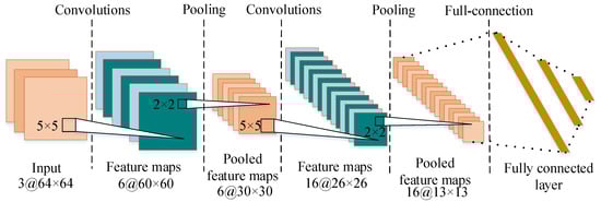 Based on experience and comparison, the proposed CNN structure was finally determined as shown in Figure 8. There are two alternating convolutional and pooling layers in the proposed CNN structure. The size of the convolution kernels (filter) in the first and second convolutional layers is 6@5 × 5 and 16@5 × 5, respectively, which determines the number and dimensionality of the feature maps. The process of pooling operation can reduce the size of the image by selecting the dominant pixels on the feature map, and the kernel size of both pooling layers is 2 × 2. Meanwhile, to fully capture the features of the images and control the size of feature maps, in this study, the strides of convolutional kernels and pooling kernels are set to 1 and 2, respectively. In addition, three successive fully connected layers are designed to calculate the final feature information by converting the pooled feature maps to the 1-D vector. Eventually, the image classification is implemented by a softmax process.