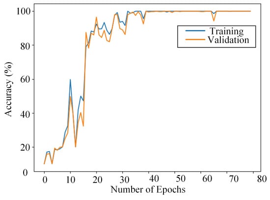 Figure 10 shows the training process of CNN-2704-126-64. It can be seen that when the epoch was around 70, the accuracy of the training dataset is close to 100%, and the training loss is minimized accordingly, which indicates that the structure has good fitting performance.
