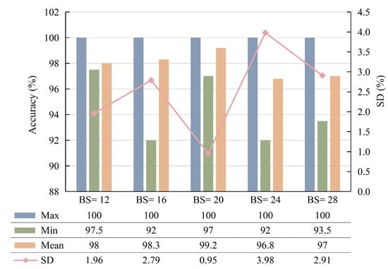 The batch size (BS) is one of the most important hyperparameters in deep learning, which represents the number of samples picked for a training session. It affects the degree of model optimization as well as the speed of optimization by changing the GPU memory usage. In order to select the most suitable BS, the diagnosis performances of different BS are compared, which are shown in Figure 11. The results show that the model achieves the best performance when BS = 20; its maximum, minimum, mean, and SD of testing accuracy are 100%, 97%, 99.2%, and 0.95%, respectively.