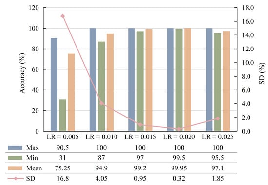 The learning rate (LR) determines whether and when the objective function can converge to a local minimum. A suitable LR can make the objective function converge fast and efficiently. To this end, the diagnostic performances of different LR are compared, and the results are shown in Figure 12, from which it can be seen that the best performance with a mean accuracy of 99.95% is achieved when LR = 0.02. In addition, it has a low SD of 0.32%, which indicates that the proposed parameter combination has very stable performance.