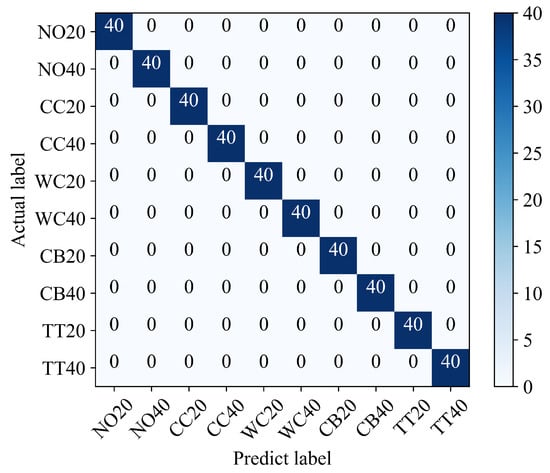 Based on the above comparison and analysis, the hyperparameters of the proposed diagnosis model are finally determined as BS = 20 and LR = 0.02. The confusion matrix of diagnosis results is illustrated in Figure 13, where the columns represent prediction labels and the rows represent actual labels, and the intersection of them represents that the predicted conditions are consistent with the actual conditions. As shown in Figure 13, all the 400 testing samples, divided into 10 conditions, are matched with an accuracy rate of 100%, which demonstrates that the proposed method is quite effective in transformer fault diagnosis.