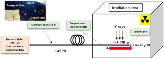A sample of Ce3+-doped vitreous silica rods was prepared using the sol-gel method at FiberTech Lille platform of the University of Lille, as described elsewhere []. Then, this rod was drawn at a temperature of about 2000 °C down to a submillimeter diameter (about 220 μm). For RL measurements, the experimental setup was composed of 1 cm-long piece of the Ce3+-doped cane spliced to 5 m long and 220 µm diameter radiation-hard multimode optical fiber. This fiber, supplied by Exail, was used as a transport waveguide for the RL signal.