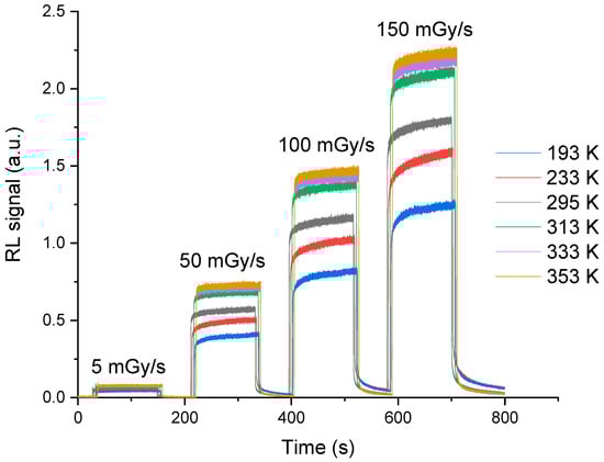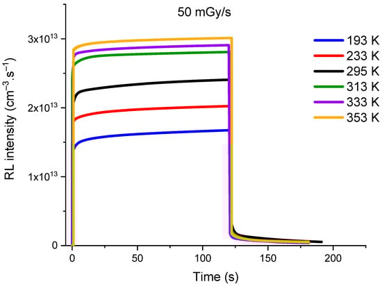 After placing the sample on the temperature-controlled plate and connecting the transport fiber to the PMT, we performed the measurements in temperature ranges from 293 to 193 K, then from 313 to 353 K (295, 233, 193, 313, 333, 353 K). At each given temperature, the sample was exposed to four different dose rates (5, 50, 100, and 150 mGy/s). In this measurement part, the sample was exposed to X-rays for 120 s, and the data acquisition was continued for 60 s after the irradiation to allow the detection of the phosphorescence signal. Furthermore, in our measurement conditions, the measured RL signals were influenced neither by the Cerenkov effect since we work with an irradiator with an average energy fluence of 40 keV, nor by other stem effects coming from the transport fiber since it was protected by a thick lead cover.