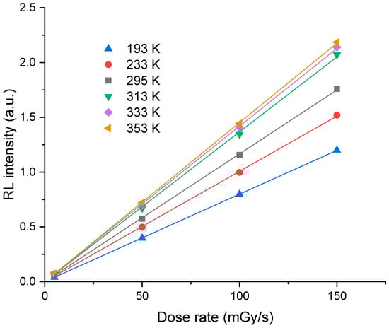 Dose rate dependence of the RL response of the cerium-doped silica cane exposed to irradiation at different X-ray dose rates obtained at different temperatures ranging from 193 K to 353 K. Each point represents the average RL signal in the pseudo-plateau region.