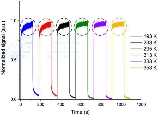 Example of normalized RL signal dynamics recorded from the cerium-doped silica sample at a dose rate of 50 mGy/s at different measurement temperatures. The dotted circles show the pseudo-plateau zones.