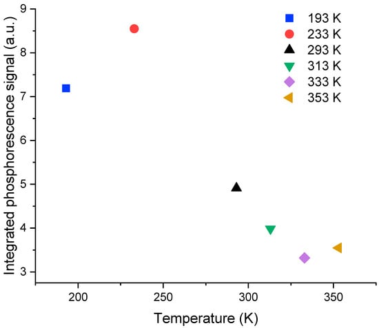 Integrated phosphorescence signal response of the cerium-doped silica cane, 60 s after the end of irradiation, as a function of the temperature ranging from 193 K to 353 K at a dose rate of 50 mGy/s.