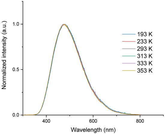 Normalized RL spectra of the cerium-doped silica cane spliced to a transport fiber obtained at different temperatures, ranging from 193 K to 353 K, under 50 mGy/s dose rate.