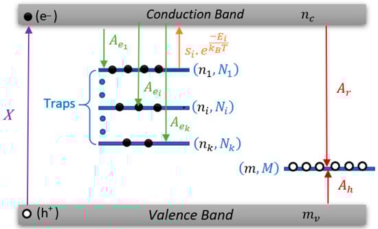 The schematic details of the model describing the trapping-detrapping-recombination processes in the active matter are shown in Figure 7. Under X-rays, after the production of electron-hole pairs, electrons have two possible evolution paths. They can be trapped by a set of discrete trapping levels. Then, they may remain trapped or be released, depending on the measurement temperature conditions. The second possibility is to recombine directly with holes on RC, without trapping, by emitting photons. It should be noted that thermal detrapping is not negligible in the process of RL. Hence, the mathematical term describing the electron’s release rate by thermal effect must be considered in the equations.