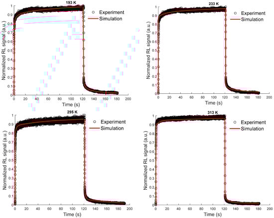 Figure 8 presents the results of the simulation as well as those of the experiments for a dose rate of 50 mGy/s at different measurement temperatures, previously shown in Figure 4. As can be observed, the simulations reproduce the RL signals in their different zones at each temperature. It should be emphasized that all the fixed kinetic parameter values used to obtain these simulation results, listed in Table 2, do not change for all dose rates and measurement temperatures. The differences in the RL shape shown at different temperatures in Figure 4 and Figure 8 can be explained considering the trap levels distribution in the matrix bandgap and their concentrations. It depends, in particular, on the metastable trap concentrations at each measurement temperature. For instance, at temperature 193 K, the involved traps (metastable) in the kinetics are the shallowest ones (from E1 to E3) and the other traps, given their stability, have less impact on the signal shape. Likewise, at 233 K, the traps at E4 and E5 must be added to describe the RL signal shape. Thus, at this temperature, the trap states from E1 to E5 are involved. The same logic should be applied to all other temperatures, where deeper traps are activated when the temperature is increased. Hence, the notion of metastable and stable traps is relative to the measurement conditions.