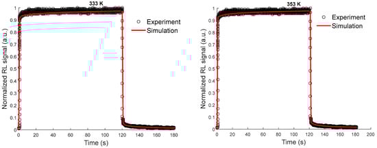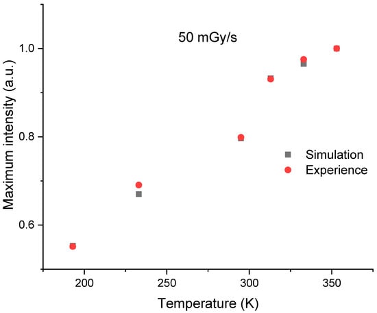 Comparison of experimental and simulated RL signal intensities, after 100 s of irradiation, for a dose rate of 50 mGy/s at different measurement temperatures. These intensities have been normalized to their values at 353 K.
