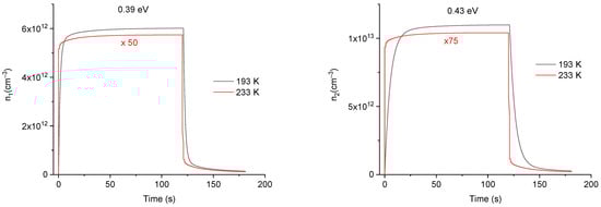 Comparison of the trap charge carriers’ concentrations at different energy levels resulting from the simulation at two measurement temperatures, during and after stopping the irradiation at a dose rate of 50 mGy/s. The multiplying factors applied to the 233 K curves have been chosen to facilitate comparison with temperature 193 K.