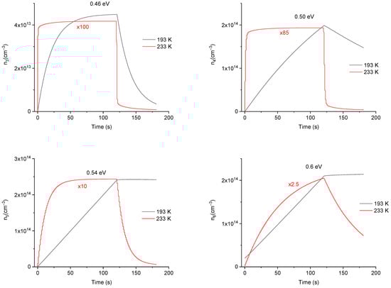 Figure 9 shows the simulated time evolution of the charge carriers’ concentrations for different trap levels at temperatures of 193 K and 233 K during and after irradiation. For simplification and legibility, only the electron concentrations of the first six traps have been represented. This Figure 9 clearly shows that the carrier concentration of each trap first begins to increase up to a maximum and then decrease to tend toward an equilibrium state, where in Equation (2). However, the dynamics of this common behavior essentially depend on the trap depth. For example, the concentration curves for 0.39, 0.43, and 0.46 eV at 193 K increases quickly during irradiation and show a tendency towards an equilibrium state, where the number of trapped electrons equals the number of released ones. On the other hand, for the trap levels at 0.50, 0.54, and 0.60 eV at the same temperature, their charge concentrations rise slowly without showing any tendency towards an equilibrium state. Similarly, with regard to the phosphorescence part after stopping the irradiation, while the first traps populations (at 0.39, 0.43, and 0.46 eV) show a rapid decrease, the deeper traps populations (at 0.50, 0.54, and 0.60 eV) either show a slight decrease of their population or even remain stable without detrapping. Moreover, the trap populations at 233 K show a rapid trend toward an equilibrium state compared to 193 K, both during and after irradiation. The higher the temperature, the faster the dynamics of the trap populations and the lower the equilibrium concentration.