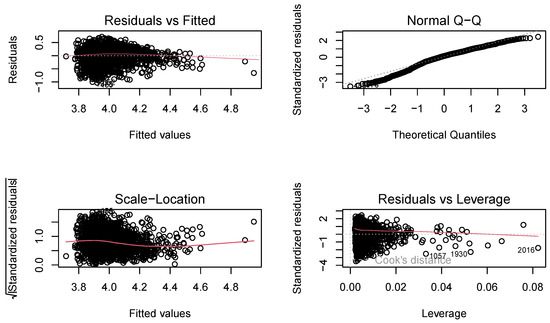 Model diagnostic plots, which consist of four subplots, with the top-left plot titled “Residuals vs. Fitted” used to evaluate the assumption of a linear relationship. The top-right plot titled “Normal Q-Q” was used to test the normality of the residuals. The bottom-left plot titled “Scale-Location (or Spread-Location)” was employed to examine the homogeneity of variance of the residuals. Finally, the bottom-right plot titled “Residuals vs. Leverage” was used to identify influential cases that may significantly impact the regression results when included or excluded from the analysis.