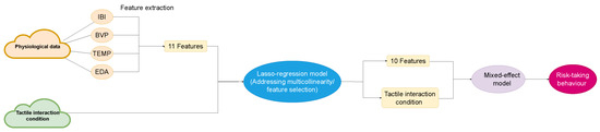 The model incorporated physiological data and human–robot tactile intensity as input, with the dependent variable representing behavioural variables (conditions that consist of four classification variables). The random effect for the jth observation in the ith group, which captures the variation in the intercept and/or slope among the different groups was represented by , while coefficients for IBI, EDA, BVP, and TEMP features were represented by to . While the residual component represented variability in residuals unexplained by fixed and random effects. Subscript means the jth observation in the ith group. is the response variable (BART scores) for the jth observation in the ith group. is IBI features, means BVP features, represents EDA features, means the average change of temperate rate, and indicates the human–robot tactile interaction intensity. to typically represent the fixed effect regression coefficients, which represent the average change in the response variable for a unit change in the corresponding predictor variable, assuming all other predictor variables are held constant. These coefficients were estimated from the data and used to make predictions for new observations. In contrast, the random effects in a mixed effects model represents individual deviations from the fixed effects, and they are assumed to follow a certain distribution. By including both fixed and random effects, mixed effects models can account for both systematic variation due to known predictors and random variation due to unobserved or unmeasured factors.