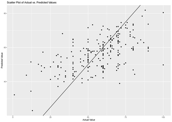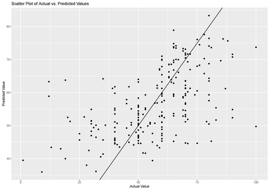 The data flow is outlined in Figure 4. We obtained an RMSE of 14.73, an MAE of 10.97, and an of 0.30 on the test dataset. Figure 5 shows the comparison between the scatter plot of actual risk-taking behaviour and predicted risk-taking behaviour. Among the selected features, the TCR was identified as the most significant predictor, followed by , , , and tactile interaction intensity. The remaining features were found to have relatively less importance in predicting the target variable. This approach provides a baseline framework for analysing the relationships between physiological and risk-taking behaviour.
