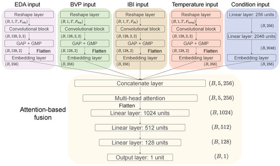 Specifically, the MCMA model in Figure 8 can be divided into two parts: the multi-input branch and the attention-based fusion. For the multi-input branch module, since the raw data of EDA, BVP, IBI and temperature vary in length in time, we chose the mode of each type of sequence data length in each record as its final input length. On the training set used in this paper, the length modes of EDA, BVP, IBI, and temperature were 72, 1200, 16, and 72, respectively. Therefore, the corresponding inputs were (), (), (), and (), where B is the batch size. To extract the features of these time series using the convolutional block in Figure 9, these time series were further sliced into T time steps and transformed into a 2-dimensional matrix with T rows. The T used in this paper is 8, resulting in , , , and being 9, 150, 2, and 9, respectively. Note that since is 2, the pooling size in the convolutional block of the IBI input branch is instead of the default , which retains as much information regarding the data at each time step as possible. In the convolutional layer, batch normalization (BN) was used to prevent model overfitting in training [36]. Following this, the convolution block was used as a pooling layer composed of global average pooling (GAP) and global max pooling (GMP) to downsample the feature map, thus reducing the number of model parameters [37]. To exploit the advantages of GAP and GMP, we summed the averaged and maximized representations. For the condition input branch, this we used one-hot encoding for the 4 class conditions, so its input dimension is (). Raw data with semantic types and input conditions were finally mapped to high-level representation vectors of dimension () using an embedding layer with 256 units.
