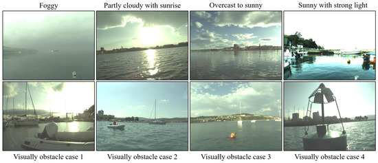 - MaSTr1325 [42]: Marine Semantic Segmentation Training Dataset (MaSTr1325) is specially used to develop obstacle detection methods for small coastal USVs. The dataset contains 1325 reality-captured images, which include obstacles, water surface, sky and unknown targets, covering a series of real conditions encountered in coastal surveillance missions. It captures a variety of weather conditions, which range from foggy, partly cloudy with sunrise, overcast to sunny, and visually diverse obstacles, which are shown in Figure 2. The image size of MaSTr1325 is .