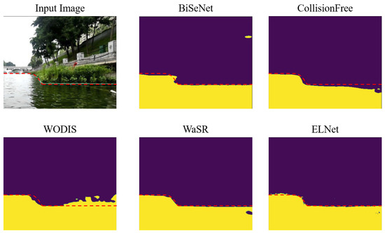 The utilized model on USVInland is also training on the MaSTr1325 dataset, the purpose of which is to evaluate the capability of transfer learning. The experimental results are illustrated in Figure 5 and Table 4. Since the ground truth does not distinguish the sky and obstacles, we have to compare the quality of obstacle–water segmentation and the water–sky-line only. From Figure 5, we observe that WaSR and ELNet achieve more accurate edge detection through labeling the obstacle–water edge manually. CollisionFree fails to perceive the boundary of water the in river scenarios. For the segmentation result, ELNet has less false positive pixels on detecting water regions.
