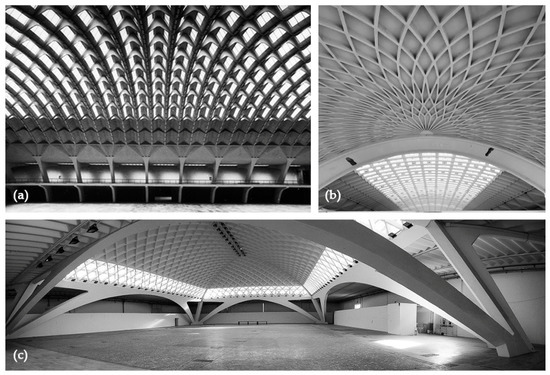 The wide and impressive reinforced concrete vaulted structures of the Nervi’s halls (photos from the archive of the conservation plan—Politecnico di Torino): (a) the wide undulated vault form pavillon B; (b) the semi-dome ribbed vault of the exedra, pavillon B; (c) the inclined arches from C pavillon.