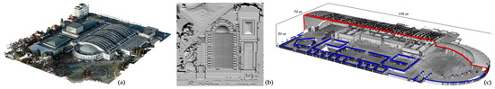 (a) Point cloud derived from the photogrammetric process; (b) Shaded view of the Digital Surface Model derived from the photogrammetric process; (c) Horizontal (blue) and vertical (red) sections of the point cloud (pavilion B) collected using the Swift system.